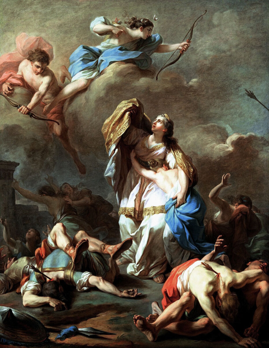 Ужасающая судьба выпала на долю Ниобе – царице Фив. Прекрасная царица Ниоба была дочерью Тантала и женой фиванского царя Амфиона. У супругов было шесть сыновей и семь дочерей. Статью и красотою походили юные царевичи и царевны на бессмертных богов. Богатство, счастье и прекрасных детей даровали ей боги. Казалось, живи и радуйся. Но боги так и не увидели от дочери Тантала благодарности. Однажды всех женщин семивратных Фив звала принести жертву богини Латоне и её божественным близнецам, далекоразящему Аполлону и девственной Артемиде, вещая Манто, дочь прорицающего старца Тиресия. К Ниобе прибежала служанка и передала ей слова вещуньи. Встала со стула дочь Тантала и горделиво произнесла: -Хм. Я ли должна приносить им жертвы! Эти высокомерные слова услышала Латона и, естественно, разгневалась. Она призвала своих детей. Первым на зов откликнулся красавец Аполлон. -Ты желала меня видеть, мама? – вместо приветствия любящим тоном в голосе сказал Феб. – Что-то случилось? -Да! – громогласно отв