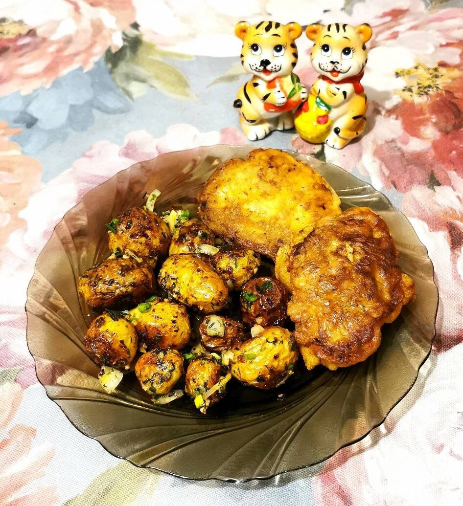 Молодой ароматный картофель и свинина отбивная в пивном кляре
