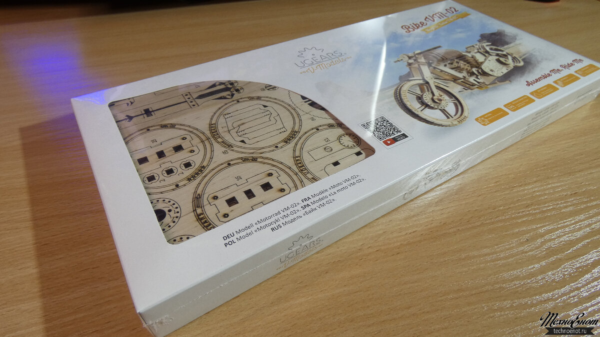 Итак, наша команда получила подарок в виде сборной модели мотоцикла «Bike VM-02» производства компании Ugears. Помнится, в мои школьные годы, была такая детская поговорка: «трудное детство, деревянные игрушки…». Действительно деревянные игрушки это что-то очень простое, статичное и не слишком интересное. Нет, конечно, были деревянные строительные конструкторы, в которых можно было собрать дом или игрушечный замок, но например с германским пластмассовым конструктором многоэтажки его было не сравнить.