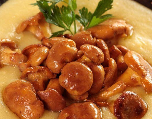 ИНГРЕДИЕНТЫ ПОРЦИИ 4 Свежая кукуруза 50 г Кукурузная крупа 100 г Молоко 300 мл Тертый сыр пармезан 20 г Сливочное масло 15 г Лисички 120 г Специи по вкусу 1.В сотейник налить молоко и заварить поленту, как манку, всыпая в молоко крупу. 2.По вкусу можно добавить специи и дольки свежей кукурузы. 3.Довести до готовности (около 15 минут). 4.Заправить пармезаном. 5.Лисички обжарить на сливочном масле, добавив зубчик чеснока, который после жарки нужно выкинуть. 6.Поленту выложить на тарелку, украсить лисичками и полить оливковым маслом. Понравился рецепт — поделитесь им с друзьями в социальных сетях! Готовьте вместе с «Едой»!
