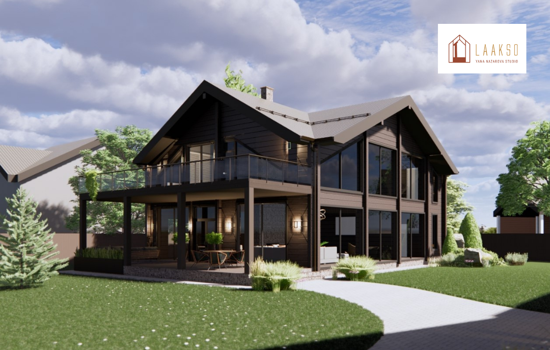 «Rauha» Общая площадь участка: 1170 м. Площадь дома: 284 кв.м. На участке также спроектирована баня, 123 кв.м. Фундамент: УШП Материал несущих конструкций: клееный брус Количество проживающих: 5 человек Для семейного отдыха и приема гостей за городом заказчики хотели обустроить комфортный дом с банным комплексом. Изначально материалом стен был выбран брус, стояла задача сделать внешний вид современным, чтобы дом не читался как избушка. Ограничения поселка диктовали коричневый цвет фасада и определенный материал кровли. У заказчиков был неприятный опыт с другим архитектором, однако с первых эскизов стало понятно, что мы нашли общий язык. Просторная зона гостиной-столовой с выходом на террасу должна была стать центром дома. Ее необходимо было расположить на южную сторону, на участок и с видом на баню. За счет больших окон и двусветного пространства помещение выглядит объемным: большая компания друзей может как смотреть телевизор, так и ужинать и общаться, переходя на просторную террасу н
