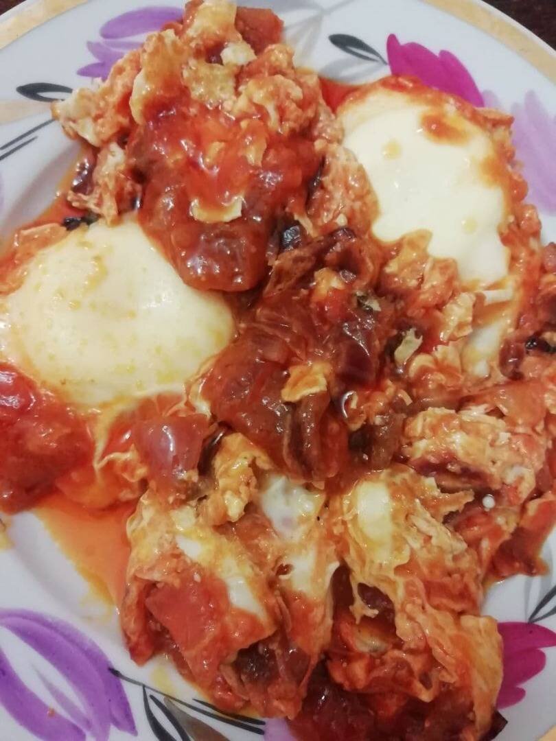 Вкусно, сытно! Ингредиенты: Яйцо куриное, Лук репчатый, Томатная паста, Соль, специи, Растительное масло для жарки Способ приготовления: Лук нарезать, как вам нравится. Сковороду разогреть с растительным маслом, выложить лук, обжарить до золотистого цвета. Томатную пасту развести в воде (совсем немного водички). Вбить яйца, посолить, добавить специи, влить томатную пасту, обжарить до готовности яиц. Приятного аппетита.