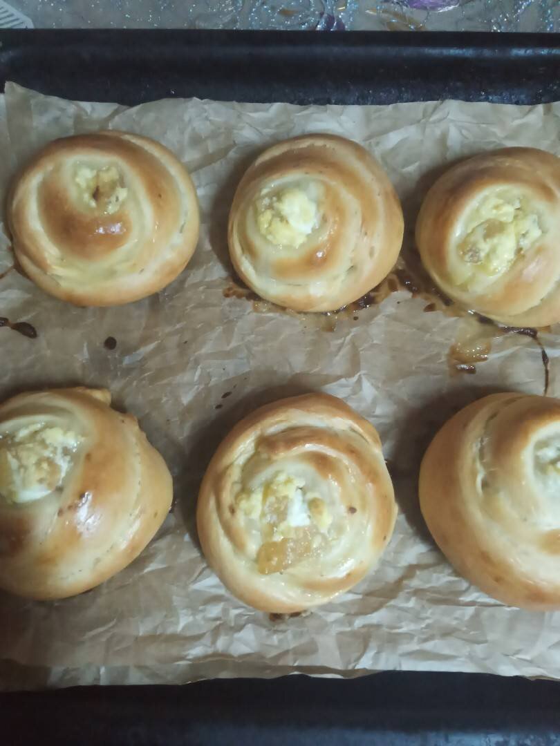 Ингредиенты: Тесто:, теплого молока, растопленного сливочного масла, сахара, соли, яйцо, сухих дрожжей, Ванилин или ванильный сахар, Муки сколько возьмёт, я на глаз сыплю, чтобы не сильно забитое, Начинка:, творога, яблочного густого варенья Способ приготовления: Замесить тесто, Дать подняться 2 раза. Сделать начинку. Творог смешать с вареньем (у меня грушевое, домашнее варенье) Сформировать булочки Для этого сделать шарики гр. по 80, раскатать в пласт, диаметр примерно 10 см, сделать по краям 3 надреза, см по 2. На середину выложить творожную начинку и по кругу, сначала один лепесток обернуть творог, защипнуть, и так с остальными лепестками. Дать постоять мин.15 на расстойку, смазать желтком + 1 лож.молока и выпечь до готовности.