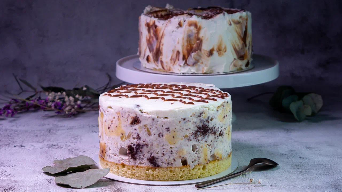Ингредиенты: Сметанный бисквит Яйца (крупные, кат. С0) 4 шт. Сахар 350 г Масло сливочное 180 г Сметана, 15-20% 180 г Мука [1] 270 г Мука [1] 30 г Какао 20 г Сода (разрыхлитель ) 1 ч.л. Соль 2 г Сметанный крем Сметана (25-30%) 800 г Сахарная пудра 150 г Желатин 9 г Ананасы консервированные 2 бан.[1] Крем покрытия Сыр сливочный 400 г Сахарная пудра 60 г Сливки 33-35% 60 г Ганаш на молочном шоколаде Шоколад молочный 50 г Сливки 33-35% 30 г В расчете на 3 торта d = 14 см. Шаг 1 Приготовьте сметанный бисквит 1. Все продукты должны быть комнатной температуры. 2. Сливочное масло растопите и слегка остудите. 3. Яйца, сахар переложите в чашу миксера взбейте на высокой скорости до пышности и посветления. 4. Добавьте к яйцам сливочное масло, сметану и перемешайте на невысокой скорости. 5. Просейте муку [1] с содой (разрыхлителем) добавьте соль и перемешайте. 6. Затем смесь из сухих ингредиентов добавьте к основной массе и на невысокой скорости миксера перемешайте все до объединения. 7. Раздели