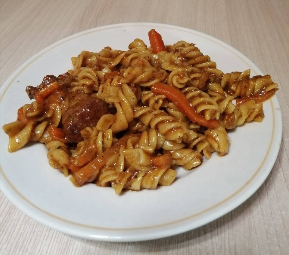 Ингредиенты: говядина, Макароны, морковь, лук, Масло растительное, Соль, перец Способ приготовления: Почистить лук, морковь. Порезать морковь брусочками. Лук порезать кубиками. Мясо нарезать небольшими кубиками. Казан разогреть, добавить масло, выложить овощи и мясо. Жарить все ингредиенты 4-5 минут. Добавить специи и воду, примерно стакан. Тушить все до готовности, около 20 минут. Выложить в казан макаронные изделия, если воды слишком мало, то добавить кипяток. Накрыть казан крышкой и готовить 6-7 минут.