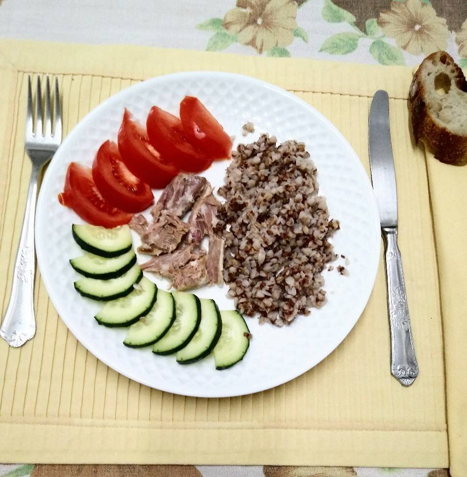 #завтрак #гречка #быстропросто Гречневая каша с овощами - отличный вариант сытного завтрака. Ингредиенты: гречки, помидор, огурца, отварное мясо (говядина, свинина, курица) Способ приготовления: Гречневую крупу промыть. Залить кипятком на ночь. Закрыть крышкой. Помидоры и огурец помыть. Нарезать полукружочками. Выложить на тарелку. По желанию можно добавить немного отварного мяса. Гречку разогреть в микроволновке, посолить по вкусу. Выложить на тарелку. Вкусный и сытный завтрак готов. Приятного аппетита!!!