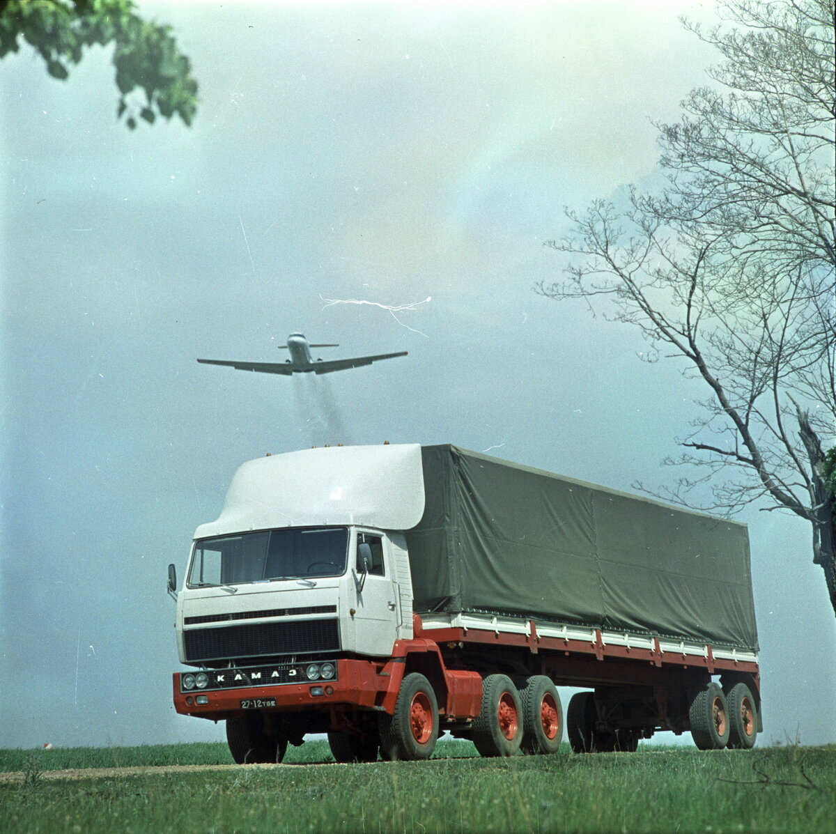 В 1970-х годах конструкторы КАМАЗ решили воплотить в жизнь все передовые идеи того времени, а возможно даже опередить его. Задача была очень тяжелой. Нужно было разработать автомобиль, который будет иметь хорошую проходимость, сниженный расход топлива, иметь отличную маневренность даже на высоких скоростях. При этом это должен быть тягач. Что бы максимально закрыть все имеющиеся задачи, тягач перевели на односкатную ошиновку. А значит пришлось разработать совершенное новые колеса для этого автомобиля. Новая шина могла выдержать 12 тонн на одну ось. Она была более широкая, следовательно, пятно контакта лучше. Что положительно сказалось на сцеплении с дорогой. При чем все три моста авто были идентичные, а значит вопрос бюджетности сборки бал так же закрыт. Плюс было решено на все оси ставить пневмоподвеску. Но размер пневмокамер должен быть не большой. Как это сделать? Просто увеличили давление в пневмотической системе почти в 3 раза (с 6 до 16 атмосфер). Для повышения устойчивости авт