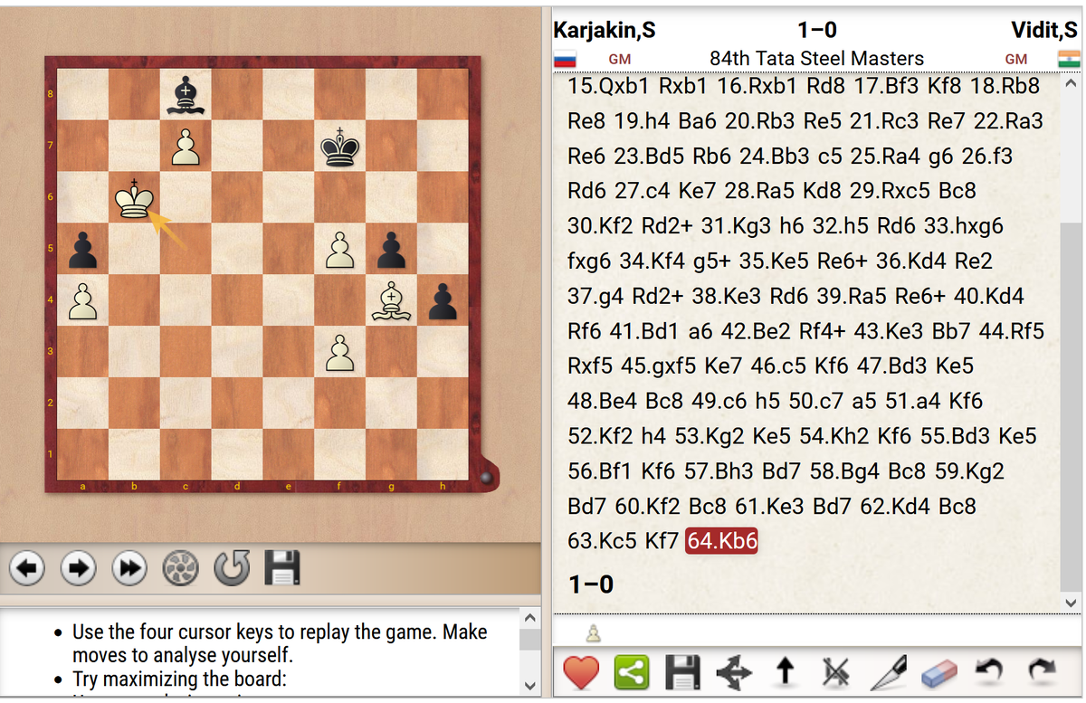 Сергей Карякин закончил турнир в Вейк-ан-Зее победой над Видитом, хотя, как сам признаётся, был готов и к мирному результату. (Здесь и далее в цитатах - перевод с английского Chess-News): "Соперник предложил ничью где-то в районе 10-го хода. Я подумал: "Ну хорошо, сделай точные ходы в варианте - и будет ничья. Но вообще если он словесно предлагает, то это уже говорит о том, что что-то не так". Гроссмейстер в итоге поделил 5-6 места. Таблица По словам Карякина, его итоговый результат "+1" вовсе не трагедия: могло быть и хуже, учитывая вчерашнюю партию, где он в 26 ходов проиграл Сэму Шенкленду. "Это была одна из худших партий в моей жизни. После неё я уже был близок к тому, чтобы вообще завязать с шахматами. Помогло виски с колой. Только это. Иначе бы я умер..." * * * Спасибо за уделённое время. Если вам была интересна публикация, не сочтите за труд поставить лайк и подписаться на наш канал. * * * Мы в соцсетях: ВКонтакте: https://vk.com/chess_news Твиттер: https://twitter.com/C