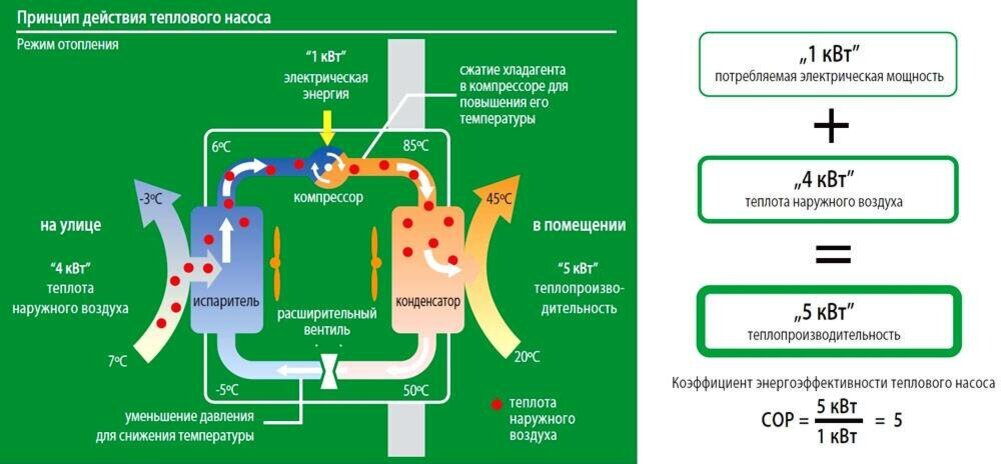 Для тех, кто первый раз слышит о тепловых насосах для отопления, можно кратко написать – это холодильник наоборот или кондиционер в режиме отопления. Тепловые насосы (ТН) в системе отопления бывают нескольких типов: воздух-воздух, воздух-вода, грунт-вода и вода-вода. Если взять самый простой вариант воздух-воздух, то схема проста: компрессор перекачивает фреон через наружный блок теплообменника. Забирается тепло снаружи и отдается внутри помещения.