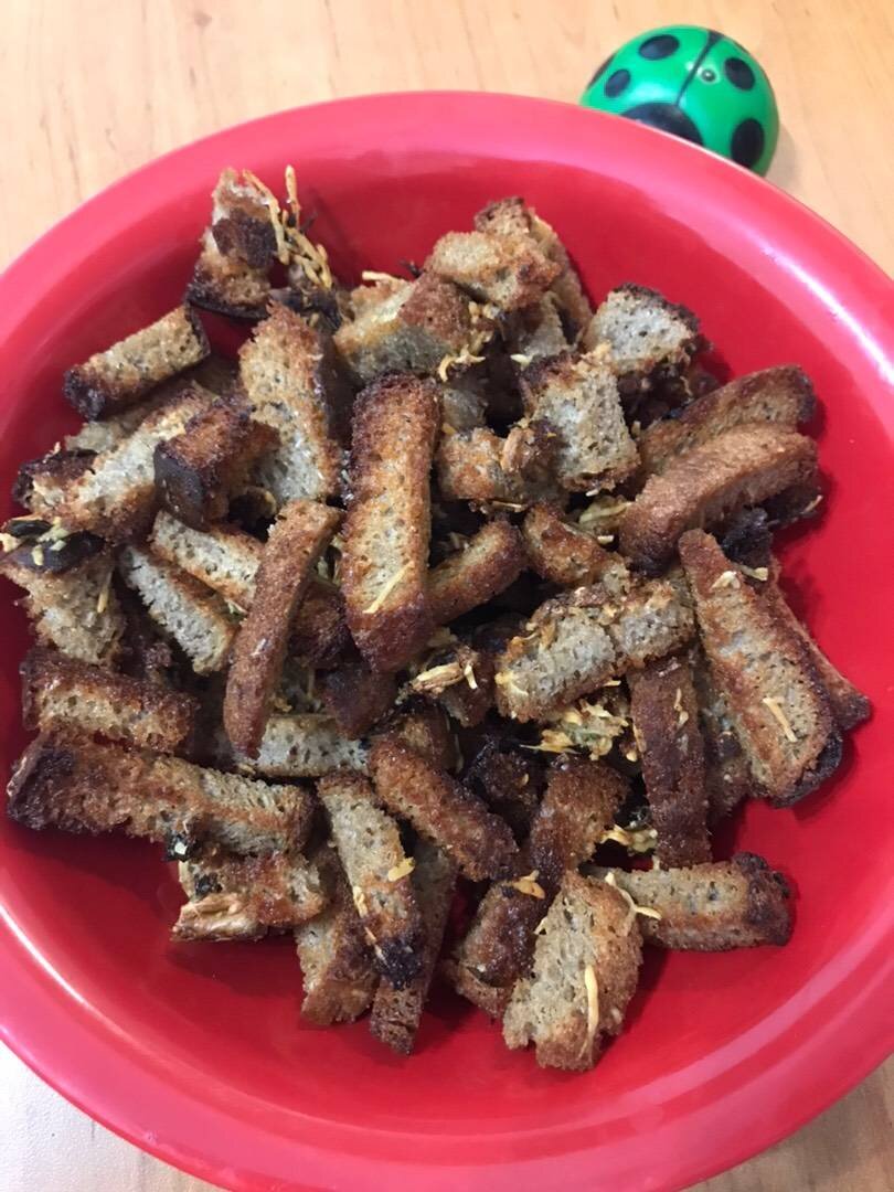 Все сложилось: остатки ржаного хлеба и сыра и рецепт от Шефа Кости Ингредиенты: чеснока, Сыр, петрушка, вкусная соль, оливкового масла Способ приготовления: Сначала головку чеснока кладём в контейнер и запекаем в микроволновке 1,5-2 минуты. Затем чеснок очищаем и растираем в тарелке с петрушкой, натертым сыром и оливковым маслом. Далее ржаной хлеб нарезаем палочками и перемешиваем с чесночной массой. Выкладываем на противень (я слегка присолила вкусной солью) и в духовку на 10 минут при 180 градусах. Хрустящие сухарики готовы!