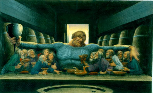 Есть у художника Константина Васильева картина "Голь кабацкая": - где Илья Муромец угощает горячительными напитками местный контингент. Композиция картина слегка навевает ассоциации, но мне кажется, это такой элемент юмора художника, нежели какое-то философское высказывание.