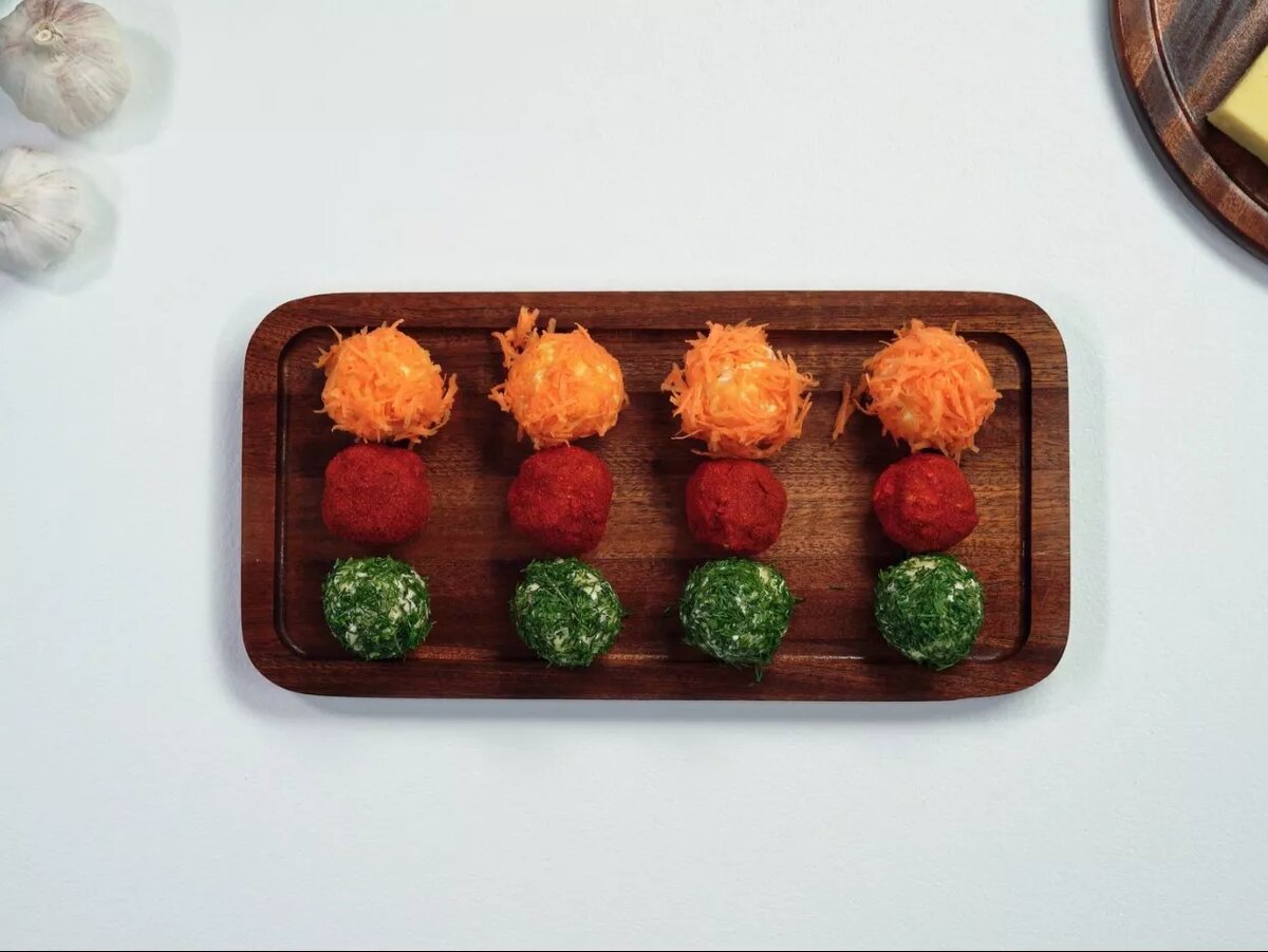 Оригинальная закуска «Цветные шарики» из курицы с сыром и чесноком прекрасно впишется в ваше праздничное меню и украсит стол. Блюдо получается очень нарядным, поэтому его можно с успехом подать и на детском празднике. Нежная отварная курица, зелень, сыр и никаких красителей! ПРОДУКТЫ для блюда на 2 порции Куриное филе 1 шт. = 150 г Твердый сыр 100 г Морковь 0.5 шт. = 40 г Майонез 1 ст. л. = 25 г Чеснок 2 зубчик = 4 г Укроп 3 веточка = 9 г Паприка 1 ст. л. = 14 г Соль по вкусу Черный перец молотый по вкусу Лавровый лист 3 лист Душистый перец горошком по вкусу СДЕЛАТЬ ПОЛЕЗНЕЕ Замените майонез сметаной. ПОШАГОВЫЙ ФОТОРЕЦЕПТ ПОДГОТОВИТЬСЯ Проверьте все необходимые ингредиенты, помойте морковь и зелень, очистите морковь, промойте куриную грудку, подготовьте рабочую поверхность. НАЧАТЬ ГОТОВИТЬ 1. Вскипятите воду для отваривания курицы. Добавьте соль, лавровый лист и душистый перец по вкусу. 2. Отварите куриную грудку до готовности в течение 20 минут. 3. Натрите сыр на мелкой терке. 4. Нат