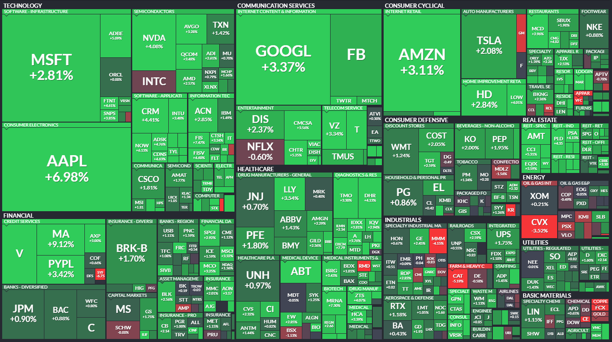 В пятницу мы увидели высокий отскок на американском рынке, S&P +2.5%, а NASDAQ в плюсе более чем на 3%! Отдельно стоит отметить акции Visa (V) и Mastercard (MA), которые взлетели ракетой +10% за торговую сессию. Также высокий отскок показал Apple (AAPL), закрывшись +7%. Это был действительно очень высокий отскок. Очень зеленая и приятная картина для инвесторов. Сегодня же фьючерс на S&P в незначительном (околонулевом) плюсе. В рамках начавшегося сезона отчетностей 77% из представивших результаты компаний сообщают о превышении уровня прибыли на акцию (EPS) над консенсус-прогнозами аналитиков. Некоторые аналитики считают, что сезон отчетностей будет оказывать поддержку рынку. 🛢 Нефть сегодня также растет, мы находимся у отметок 90$ за бочку. Низкий темп восстановления добывающих мощностей к допандемическим уровням сдерживает игроков на понижение в Brent. При таких ценах, нефтянка будет чувствовать себя отлично. Только вопрос, что предпочесть: дешевую российскую нефтянку с рисками санкци