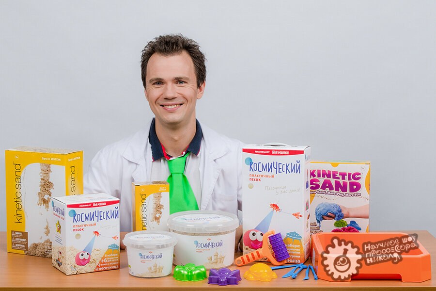 Кинетический песок Этот песок удивителен! По своим свойствам он очень похож на мокрый, он пластичный, из него можно лепить различные фигуры, строить замки, но при этом он совершенно сухой, а свои свойства приобрел специальному связующему полимеру, что сделало его невероятно популярным во всем мире! История создания: Кинетический песок на 98% состоит из обычного песка, а свои уникальные свойства он приобретает за счет добавления 2% полидиметилсилоксана (аналог силиконового масла). Добавление вещества позволило приобрести кинетическому песку свойства влажного песка, он стал пластичным. Изначально данный песок был разработан для создания скульптур из песка, но в итоге стал широко использоваться именно в качестве набора для лепки дома. Благодаря добавлению полимера песчинки легко приклеиваются друг к другу, позволяя лепить фигуры, но при этом легко отчищаются от любых поверхностей и не высыхают. Торговая марка «Кинетический песок» принадлежит шведской компании Wabafun, именно она сделала д