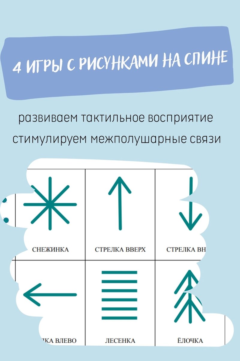 😃 Это очень полезная игра, знакомая из детства. Игра помогает снятию мышечных зажимов, развитию тактильного восприятия, стимулирует работу обоих полушарий головного мозга, развивает воображение. В конце шаблоны рисунков 🥑 1-ый вариант. Познакомьте ребенка с карточками, прочитайте ему их названия. Рисуйте на спине ребенка по очереди один из символов. Ребенок должен будет угадывать, что вы нарисовали и выбирать подходящую карточку. 🥑 2-ой вариант. Более сложный вариант игры, в нем карточки-подсказки уже не используются. Взрослый рисует на спине ребенка фигуру (простой рисунок). Ребенок должен угадать, что нарисовал взрослый, назвать и изобразить это карандашом на бумаге . 🥑 3-ий вариант. Когда дети в достаточной степени овладеют этой игрой, они смогут использовать в ней любые образы, в том числе и связанные с учебным материалом (буквы, цифры). 🥑 4-ый вариант. И последний вариант, подходящий для работы с группой детей. Дети выстраиваются в колонну друг за другом. После