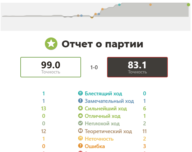 - Точность в 99% - это результат, а вот у Коренского в миттельшпиле начались проблемы - всего лишь 83,1% точность - много ошибок (5 штук) против одной всего неточности у Спасского за всю игру