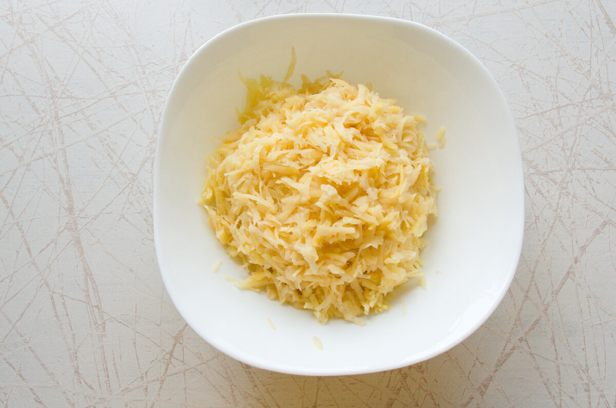 Чистим картофель и лук, натираем на тёрке. Отжимаем руками от лишней влаги. Чеснок измельчаем.