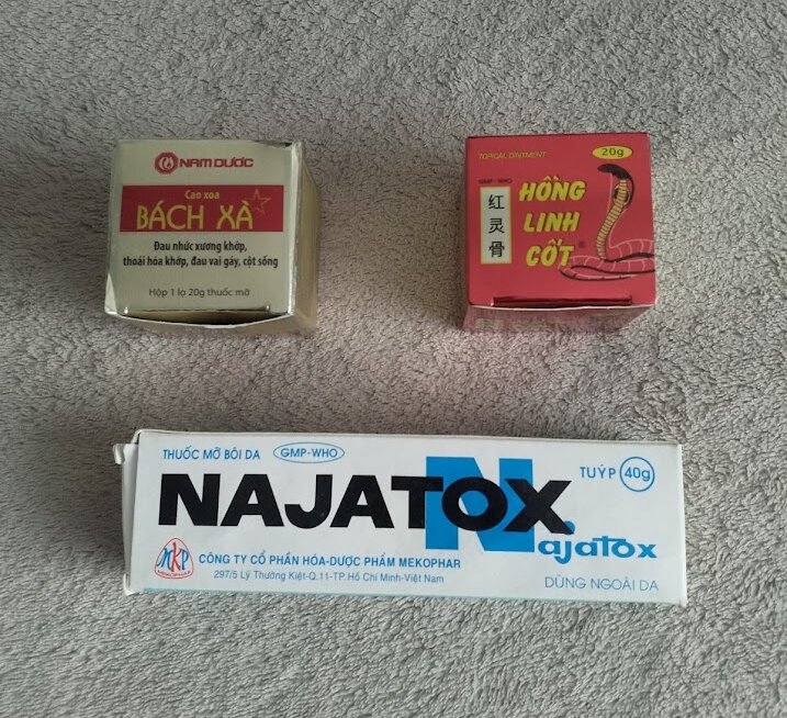 Сразу скажу, что к чудодейственным мазям, которые лечат всё я отношусь скептически. Поэтому у меня отсутствует эффект плацебо. Но даже с этой оговоркой я должен признать, что мази из Юго-Восточной Азии работают. Хорошо избавляют от боли в мышцах после тренировок, при вывихах и растяжениях. Большинство мазей можно купить за пределами Вьетнама. В любом случае стоит попробовать самому и вынести свой вердикт. Все мази, которые я тут рассматриваю имеют охлаждающий эффект, очень приятный кстати. Итак, сегодня мази и мазилки из Вьетнама. Мази на основе змеиного яда. Я купил такие, на мой взгляд самые эффективные. Состав у этих мазей практически одинаковый. Но лично мне нравится больше Bach Xa. В ней большее содержание змеиного яда, она тает на коже и на мой взгляд эффективнее остальных. Баночку Bach Xa мы почти прикончили. Ну и инструкция от Bach Xa на русском. Еще прикупил масло от ожогов с жиром питона. Ничего не могу сказать об эффективности, потому как ни разу не пользовался. Ожог + масло