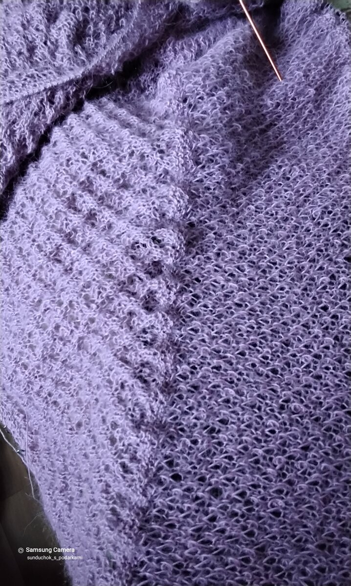 Продолжаем вязать нашу шаль. Начальные этапы вязания в этих статьях Если вы поделитесь этой статьёй в соц. сетях, она будет сохранена на вашей страничке. Смотрите также: все статьи канала «Сундучок с подарками». Также у моего канала есть групповой чат. Там вы можете задать любые интересующие вас вопросы. Я провязала схему С 5 раз, как указано в описании. Вяжем переходный участок платочной вязкой, также как мы вязали этот участок между схемами В и С. 7 ряд переходной схемы вяжем так: 3 кромочные, накид, 22 лицевые, из 1 петли вывязать 2 за переднюю и заднюю стенки — 7 раз, далее вязать лицевыми, накид, МАРКЕР, лицевая (ЦП), накид, 22, лицевые петли, из 1 петли вывязать 2 за переднюю и заднюю стенки — 7 раз, лицевые петли до конца, накид. 8 ряд: изнаночные петли, кроме кромочных. Дальше вяжем схему D. Схему каймы нужно провязать 1 раз. Заканчиваем вязать шаль 2-мя рядами платочной вязки. Закрываем петли любым эластичным способом. Проводим ВТО. Заправляем концы. Шаль готова! ✅ Смотрите т