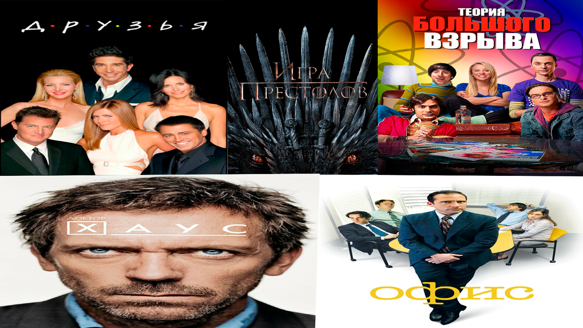 1. Друзья Сериал "Друзья", который впервые был показан на телеэкранах в 1994 году, до сих пор остается в 10 лучших, потому что его все еще смотрят. Не потому что он распиарен, а потому что там представлен хороший жизненный юмор, ситуации с которыми в жизни может столкнуться каждый и все это подкреплено тем, что в этом сериале друзья всегда себя поддерживают. 2. Игра Престолов Сериал "Игра Престолов". Скажу честно сериал тяжело начать смотреть, так как в начале тебе накидывают уйму персонажей и ты просто не понимаешь, кто к кому обращается. Но со временем так вникаешь в сериал, что не можешь оторваться. В сериале есть абсолютно все. Любовные линии, ужасы, предательство, лучшая дружба, выбор истинного пути. Посмотрите, не пожалеете. 3. Теория большого взрыва Сериал "Теория большого взрыва". Этот сериал я еще посмотрел в 2020 году в мае, когда начался карантин. Сериал рассказывает про физиков, которые пытаются выстроить отношения с девушками, а один из них просто "старается" быть в обще