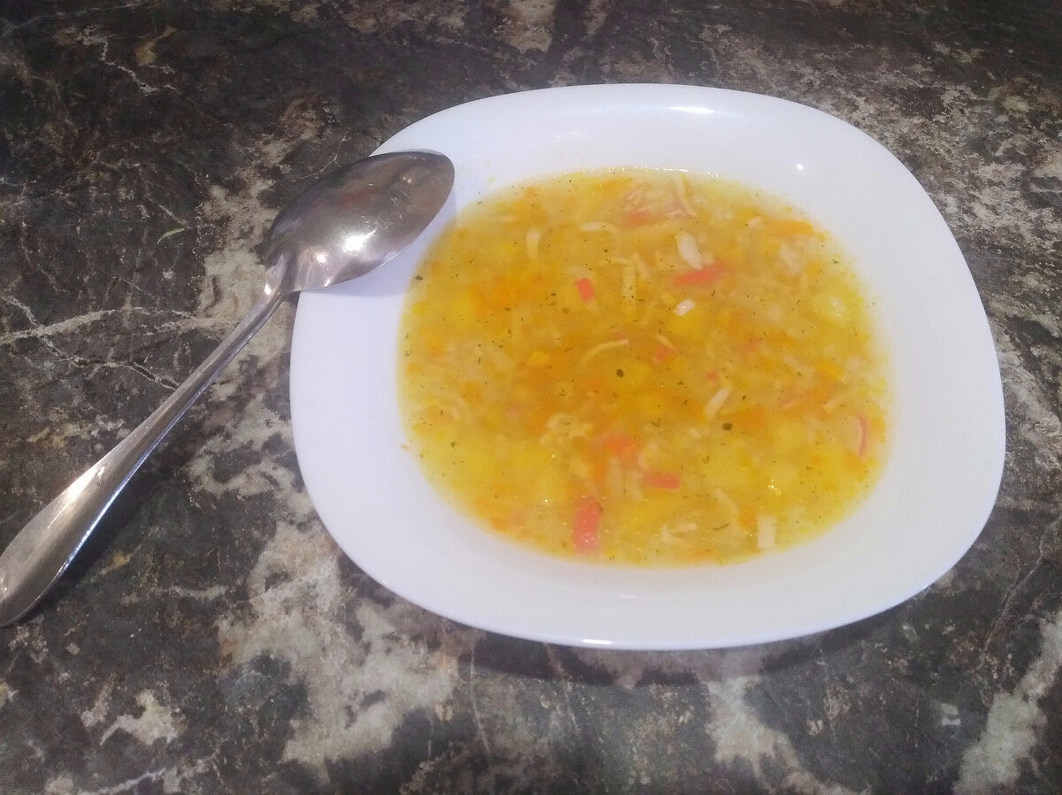 Всем доброго времени суток. Сегодня варила ленивый супчик, потому, что занималась уборкой и на долгую готовку времени не было. Готовится он очень быстро. Этот суп недавно попал в мою коллекцию любимых рецептов, я его варила уже два раза, мои мальчишки-малоежки едят с удовольствием, что не может не радовать маму. Для супа нам понадобится: Рис – 100 г. Картошка- 3 шт. Морковь – 1 шт. Лук – 1 шт. Кукуруза сахарная консервированная – 1 банка. Крабовые палочки - 1 пачка. Зелень (петрушка, укроп). Лавровый лист – 1 шт. Соль и перец по вкусу. Теперь расскажу чуть подробнее про процесс приготовления. Берем кастрюльку наливаем в нее воду и ставим на плиту закипать. Пока вода в кастрюле закипает, делаем стандартную зажарку для супа, кидаем на сковороду с растительным маслом порезанный кубиком лук и натертую на терке морковь. Когда вода на супчик закипит, добавляем в нее лавровый лист и зажарку. Картофель чистим и режем кубиком, рис промываем, после чего тоже кладем в кастрюлю с будущим супом,