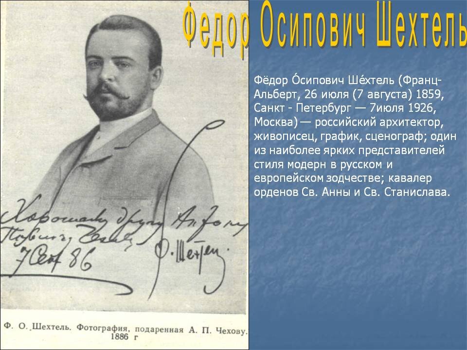 К 1878—1879 годам относится знакомство Франца Шехтеля с братом своего товарища Антоном Чеховым. Это знакомство переросло позднее в крепкую дружбу. Позднее Антон Павлович представлял Шехтеля начинающим авторам как прекрасного рисовальщика и виньетиста, называл «талантливейшим из всех архитекторов мира». Творил он в основном в различных стилях популярного тогда модерна, во всем его многообразии. Наиболее известные шедевры: #ярославский вокзал