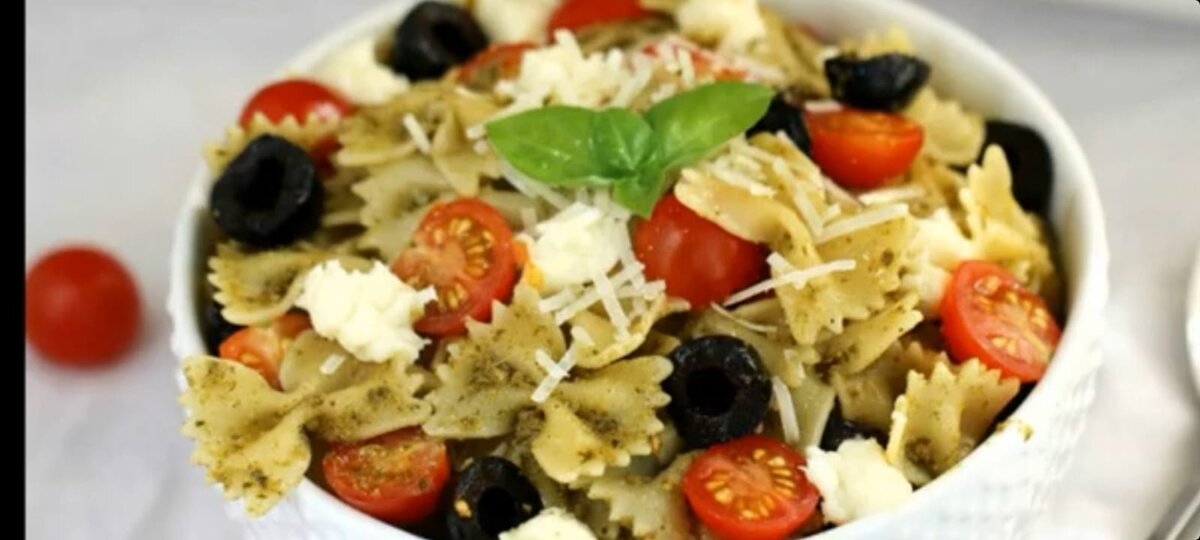 Такой быстрый и простой итальянский салат получится более красивым, если приготовить его из фигурных макарон «бантиков». Ингредиенты: - небольшие макароны «фарфалле» (450 г); - говяжья ветчина (340 г); - очищенный чесночный зубчик небольшой (одна штука); - измельченный укроп свежий (30 г); - сыр «Грюйер» (230 г); - небольшие помидоры черри (180 г); - соль морская (по вкусу); - свежая петрушка измельченная (20 г); - трюфельное масло (25 мл); - болгарский перец красный (120 г); - листья зеленого базилика измельченные (30 г); - желтый перец болгарский (120 г); - оливковый майонез (40 мл); - крупномолотый черный перец (7 г); - небольшие маслины без косточек (70 г). Процесс приготовления: Нашинковать тонкой соломкой нежирную ветчину и переложить в прозрачный салатник, добавить всю измельченную зелень. Промыть овощи, нарезать небольшими брусками болгарский перец, отправить в ту же емкость. Нарезать небольшими кубиками помидоры и отправить в салатник, измельчить чеснок и добавить к остальным