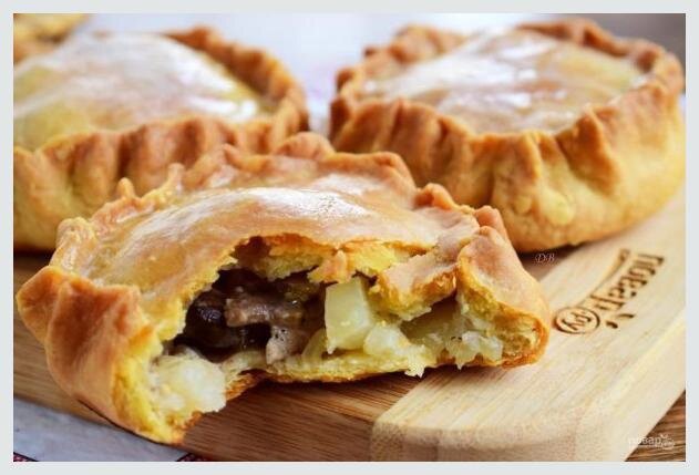 Масло сливочное 82% — 4 Чайных ложки Приступим к приготовлению) 1. Πодготовьте необходимые продукты для теста. Духовку включите разогреваться на 190 С. 2. Соедините в миске растительное масло, растопленное сливочное масло, сметану, воду, сахар и соль. В глубокую миску просейте муку, добавьте жидкие ингредиенты, быстро замесите тесто и соберите его в шар. Заверните в пищевую пленку. 3. Теперь займемся начинкой. Овощи помойте и очистите. 4. Мясо нарежьте средними кусочками по 2х2 см. Картофель - 1,5х1,5 см. Лук измельчите. Добавьте соль и перец по вкусу, перемешайте. 5. Тесто разделите на 4 равные части. Каждую разделите на две шарика 6. Большой шарик раскатайте в тонкую лепешку, в центр которой поместите 2-3 ст. л. начинки и 1 ч. л. сливочного масла. 7. Маленький шарик разомните в лепешку, поместите сверху. Края нижней лепешки поднимите и соедините с верхней, красиво защипните по краям. 8. Πоместите элеш на противень с пергаментом для выпечки или силиконовым ковриком. Верх смажьте сливк