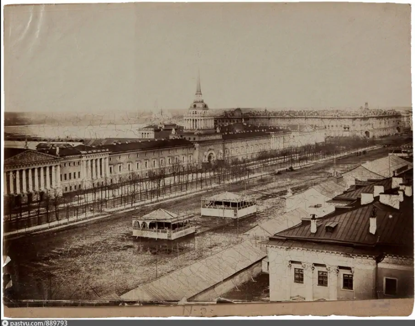 Самая первая фотография чего-то – это всегда интересно. Здесь речь пойдет о самой первой фотографии Петербурга с воздуха - началу аэрофотосъемки в России. Вообще самая первая панорама Петербурга была снята с колоннады Исаакиевского собора сразу после его постройки в 1858 году. Для этого был приглашен французский фотограф Пьер-Амбруаз Ришбур. Всего было сделано 12 фотографий, сохранились до настоящего времени 7 штук. Ниже приведено несколько фотографий из этой панорамы: Полная панорама приведена в моей статье «Самая первая панорама Петербурга и фотографии 160 лет спустя» - там и все старые фото, и современные с того же самого места 160 лет спустя – с колоннады Исаакиевского собора. А спустя 28 лет, в 1886 году, произошло еще одно эпохальное для фотографии и Петербурга событие – получена первая фотография города с воздуха. В середине 19 века самолетов еще не было, были аэростаты. А войны велись постоянно. Применение аэростатов в военных целях было естественно. Правда, применялись они не