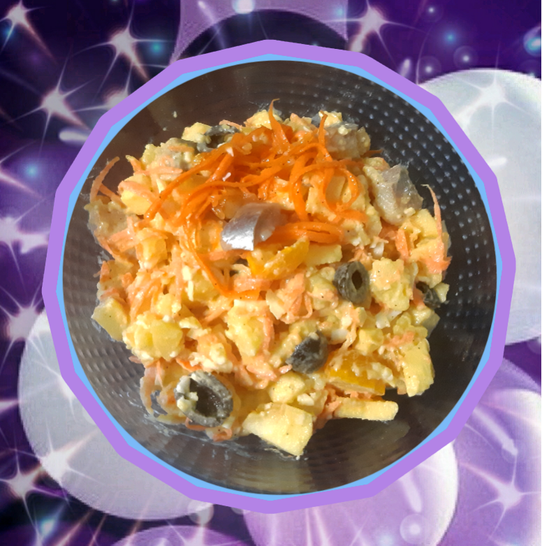Ингредиенты: Картофель, Морковь по-корейски , Яйцо, Маслины, Оливковое масло, Соль, сахар, Репчатый лук, Чеснок, Сельдь тихоокеанская ломтики, Яблоко, Томаты Черри, Майонез Способ приготовления: Приготовить морковь по-корейски: морковь натереть на тёрке для корейской моркови, положить соль, сахар и помять руками. Репчатый лук нашинковать и обжарить на растительном масле. Затем лук убрать из сковороды на тарелку. В морковь положить в середину измельчённый чеснок и влить кипящее растительное масло, в котором жарился лук. Перемешать и оставить на час. Картофель и яйца отварить в мундире, остудить, очистить и нарезать кубиками. В салатницу положить нарезанные кубиками яблоко, картофель и яйца, обжаренный репчатый лук, ломтики сельди, половинки маслин и томатов Черри. Маслины и томаты предварительно помыть и обсушить. Морковь разделить на 2 части. Одну часть добавить в овощи в салатницу и всё заправить майонезом. Хорошо перемешать. Вторую часть моркови просто выложить рядом со всем салатом.
