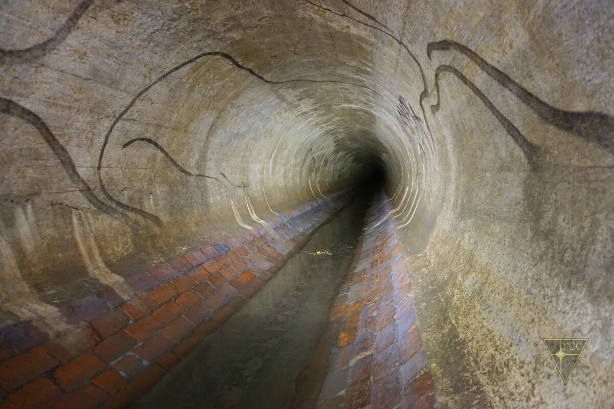 Как раз-таки в среднем течении возведена комбинированная конструкция: монолитный железобетонный коллектор с кирпичным лотком. Кирпич уже советский, но изготовлен по дореволюционным технологиям. И, как показала проверка временем, это решение оказалось удачным. Коллектор и по сей день пребывает в хорошем состоянии.