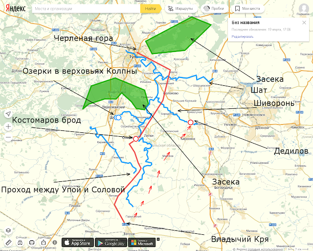 Муравский шлях: От Владычьего Кря до Черленой горы. Черновичок про то как Муравский шлях шел от главной высоты региона до Тулы. Сторожа у Владычьего Кря - последняя на Муравском шляхе. Войско Крымского хана занимает идеальную позицию для атаки. Татары пришли на главную высоту Средне-Русской возвышенности (293) не случайно. Здесь сходятся реки и водоразделы. Можно выбирать любую дорогу ведущую вниз к рекам. Это похоже на детскую игру "Царь Горы". Если же путь будет продолжаться по Муравскому шляху, то он пойдет в проход между Упой и Соловой, форсирует Упу в у Костомарова брода, "перелезет" Шат и Шиворонь и выйдет к стенам Тулы в проход между двумя засеками у Черленой горы. При таком маршруте засечные леса не страшны татарам просто потому, что они проходят между ними! Костомаров брод легко локализуется в районе современного села Костомарово, если обратить внимание на одно небольшое дополнение к тексту Книги Большого Чертежу: