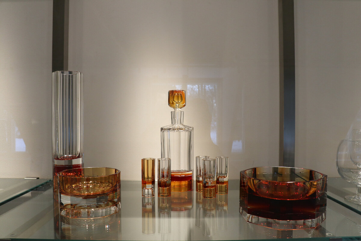 На Елагином острове в Петербурге работает прекрасный музей художественного стекла. Его создали на основе спасенной коллекции Ленинградского завода художественного стекла (ЛЗХС). При закрытии завода был реальный риск утратить все это наследие. Но, к счастью, благодаря энтузиазму главного художника завода Н.М. Гончаровой, коллекция была сохранена, и для нее даже создали специальный музей. Всего в этой коллекции около 7 тысяч стеклянных изделий. В свое время ЛЗХС выпускал эталонные образцы для многих производств хрусталя в СССР. На выставке представлены именно уникальные образцы мастеров, которые представляют собой масштабные комплекты. Потом в массовое производство запускались те или иные образцы, иногда и полные сервизы. Что-то делалось для выставок или по особым заказам (обычно правительственным), но в основном это образцы для промышленного производства. Наверное, у многих в СССР дома были такие. Интересно видеть, как менялись эстетические вкусы со временем, менялась техника гранени