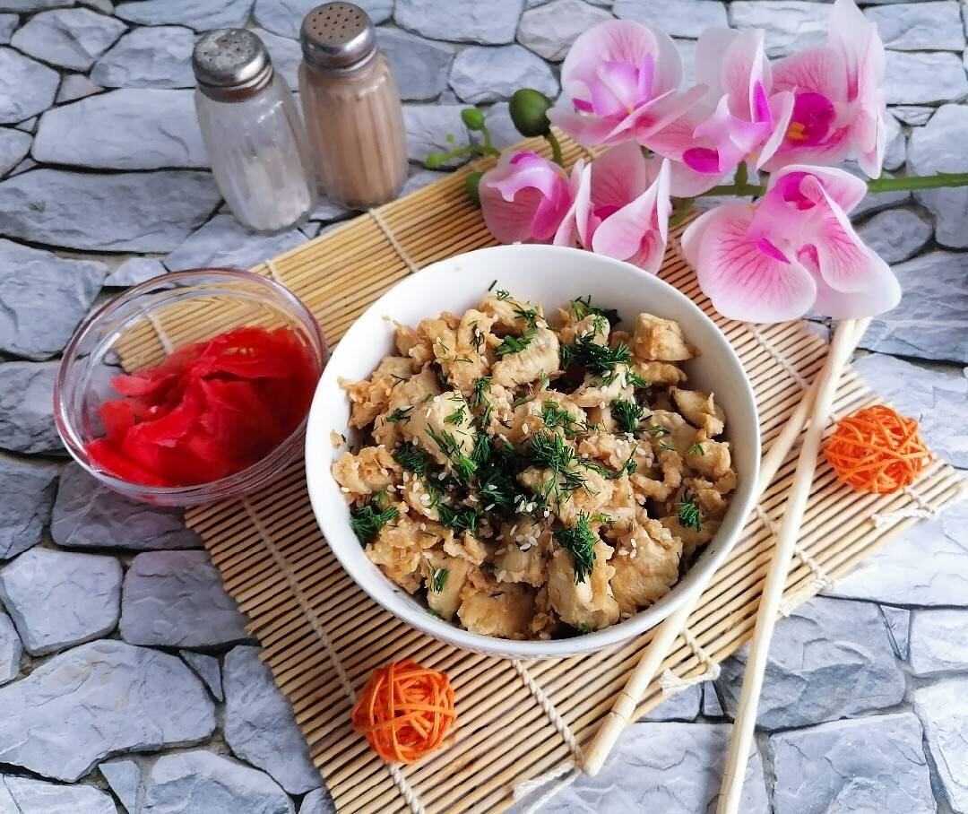 Ингредиенты: куриное филе, кукурузного крахмала, яйцо, соль и перец, растительное масло для жарки, Для соуса:, соевого соуса, рисового уксуса (можно заменить на яблочный), сахара, воды, корня имбиря, чеснока, семян кунжута, кукурузного крахмала Способ приготовления: В миске взбить яйцо с крахмалом, приправить солью и перцем. Мясо нарезать небольшими кусочками, выложить в миску с яйцом, перемешать. В сковороде разогреть растительное масло, обжарить курицу до золотистого цвета. Смешать соевый соус, воду, уксус, сахар, крахмал, измельченные чеснок и имбирь, кунжут. Влить соус к курице, перемешать и готовить до загустения соуса. Приятного аппетита!