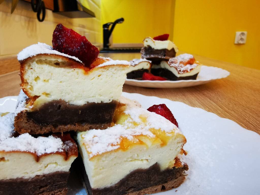 Форму для запекания лучше взять из специального стекла или специальный сплав, но только не из силикона 😁. В дальшейшем я форму себе приобрету, ну а пока читайте и вдохновляйиесь моим рецептом.❤️ #десерт Ингредиенты: Творог 9 % , Сахар , Сметана, Яйца, Мука , Какао-порошок , Разрыхлитель, Ванилин, Для украшения, Клубника свежемороженная, Сахарная пудра или какао-порошок Способ приготовления: Приготовим наши ингредиенты 🙌. Творог переложите в миску, добавьте сметану, яйца 2 шт, всыпьте сахар (50 г) и ванилин. Взбейте соединённые ингредиенты блендером так, чтобы не осталось ни одного комочка - творожная заливка должна быть нежной, гладенькой и негустой. Творожная заливка готова. Духовку включите для разогрева до 180 градусов. Теперь приготовим шоколадное тесто. Для этого в миску разбейте два яйца, всыпьте оставшийся сахар (50 г) взбейте миксером до получения пышной светлой массы. В яичную смесь просейте муку с разрыхлителем и какао-порошком. Аккуратно вымешайте однородное шоколадное тес