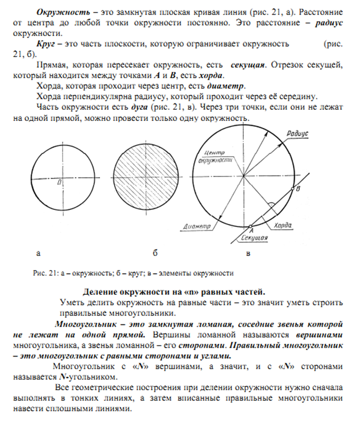 Любой правильный многоугольник можно вписать в окружность. Что нужно знать об этом, показано в этом уроке. Геометрические построения при делении окружности на n частей Деление окружности на n частей показано на рис.22. ? Контрольные вопросы: 1. В чём разница между кругом и окружностью? 2. Дайте определение, что такое многоугольник? 3. Что такое хорда? Дополнительная информация: Черчение Урок №1 Основы черчения Линии чертежа" Черчение Урок №1 (продолжение) Как наносят размеры по стандарту Черчение Урок №2 Графическая работа Чертеж плоской детали Черчение Урок №3 Шрифты чертежные ГОСТ 2.304-81 Черчение Урок №4 Чертежи в системе прямоугольных проекций Черчение Урок №5 Прямоугольное проецирование Черчение Урок №6 Расположение видов на чертеже Черчение Урок №7 Геометрические построения Черчение Урок №8 Геометрические построения (продолжение) Черчение Урок №9 Окружность Построение многоугольников Черчение Урок №10 Касательная к окружности Черчение Урок №11 Графические построения Сопряжения