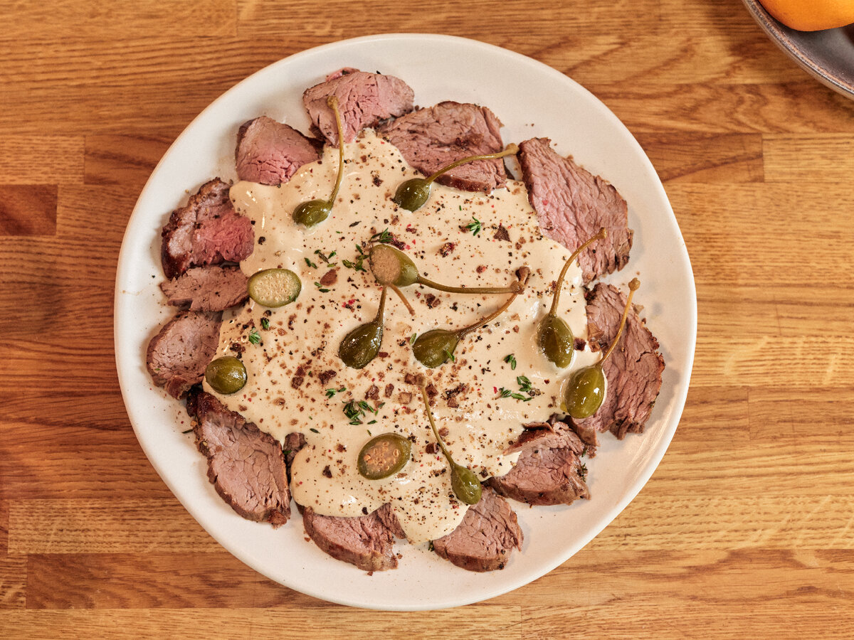 Растительное масло — 70–100 мл Приготовление: 1. Замаринуйте вырезку в оливковом масле, чесноке, тимьяне, соли и перце. Оставьте на 15 минут. 2. Быстро обжарьте мясо на смеси оливкового и сливочного масел. Далее запекайте в духовке 6-7 минут при температуре 200 градусов. 3. В стакане соедините желтки, горчицу, анчоусы, щепотку соли и перца. Пробейте блендером, вливая растительное масло. Добавьте лимонный сок и тунец. 4. Влейте натуральный йогурт “Solo” и снова перемешайте. 5. Ростбиф нарежьте т