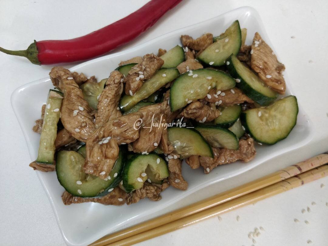 Салат состоит всего из двух ингредиентов, но все равно очень вкусный. Самое главное не передержать грудку. #курица Ингредиенты: куриная грудка, огурца, соевого соуса, кунжута, винного уксуса, сахара, Оливковое масло, Смесь перцев Способ приготовления: Куриную грудку нарезать соломкой, огурцы - полукружками. Смешать 3 ст. л. соевого соуса с уксусом и сахаром. Залить мясо и оставить мариноваться на 30 минут. На растительном масле обжарить курицу в течение 5 минут. Остудить. Для заправки смешать 2 ст. л. соевого соуса и 2 ст. л. растительного масла. Соединить огурцы и курицу, полить заправкой, посыпать перцем и кунжутом, перемешать. Приятного аппетита!