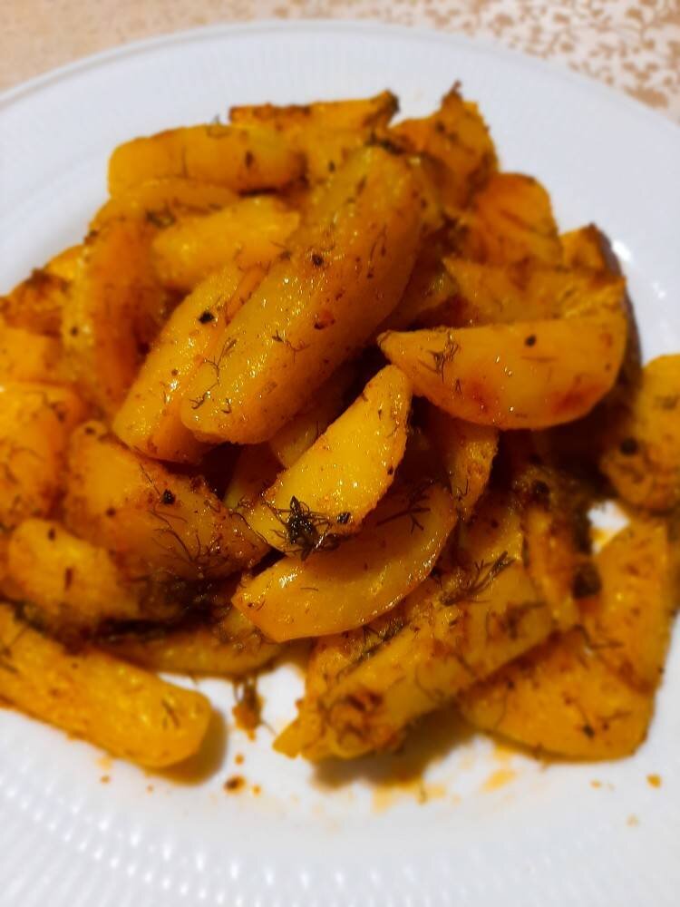 Наверное у каждой хозяйки есть свой рецепт картошки по-деревенски. Я делюсь так как любят у меня дома Ингредиенты: без кожуры картофеля, растительного масла, соли, сладкой паприки, куркумы, сухого чеснока, мускатного ореха, приправы для картофеля, Зелень Способ приготовления: Картофель чистим и нарезаем дольками. Затем закладываем его в кипящую воду и варим 3 минуты, чтобы картофель отдал крахмал. Сливаем и остужаем. Пока картофель остывает делаем соус: растительное масло, соль и все приправы тщательно перемешиваем. В картофель добавляем сначала укроп, а потом соус и перемешиваем. Выкладываем наш картофель на противень, каждую дольку отдельно. Ставим тушиться в духовку от 20 до 30 минут при температуре 200 градусов. Смотрите сами по своей духовке и как вы любите. Мы любим, чтобы окорочка была снаружи, а внутри мягкие. Ангела за трапезой.