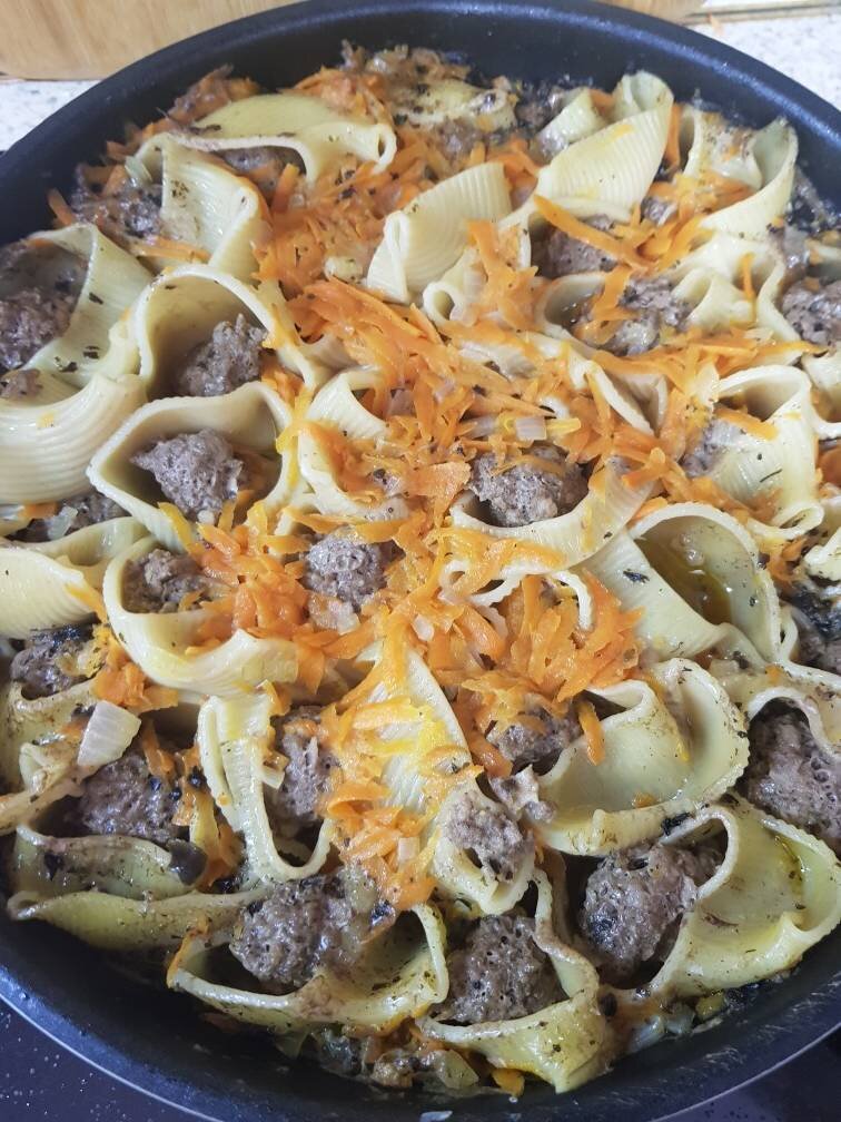 #макароны #вторыеблюда #готовимужин Ингредиенты: Фарша говяжьего, Макароны "рожки", луковица большая, морковь большая, Соль, перец , Масло растительное , Вода, Томатная паста Способ приготовления: Фарш посолить поперчить по вкусу, можно добавить любую приправу. Хорошо его отбить. Макароны не отвариваем. Наполнить рожки фаршем. Готовлю в сковороде. Лук порезать кубиками, морковь на тёрке крупной натереть. Пережарить на сковороде с добавлением растительного масла. Добавить томатную пасту. Я развожу её в стакане воды, добавить ещё стакан воды. Посолить, поперчить. Довести до кипения. Рожки уложить на сковороду и готовить до готовности. При необходимости можно добавить ещё воды. Приятного аппетита!!@