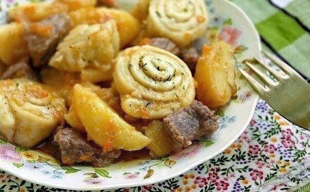 Ингредиенты: Говядина - 500 г (подойдёт любое мясо или птица) Картофель - 1 кг лук, морковь Соль, перец – по вкусу Для нудлей: Кефир - 0,5 стакана Сода - 1/4 ч.л. Соль Мука – смотреть по консистенции теста Чеснок - 3 зубчика Укроп свежий Приготовление: 2. Приготовить нудли. Вылить в миску кефир, добавить соли и соды, промешать, ввести муку, чтобы получилось не очень тугое тесто. 3. Очистить и обжарить картошку, её можно порезать на 4 части. Жарить до полной готовности не надо. 4. Мясо к этому времени должно быть почти готово, отправить к мясу картошку, долить воды – количество выбирать на своё усмотрение. Можно картошку и не обжаривать, а положить сырой – но с обжаренной будет вкуснее. 5. Из теста раскатать довольно тонкий пласт и смазать его растительным маслом. Чеснок пропустить через пресс, покрыть пласт теста чесноком, присыпать нарезанным свежим укропом и свернуть всё в рулетик. 6. Разрезать рулет на небольшие кусочки шириной около 1,5 см. 7. Довести картошку до полной готовност