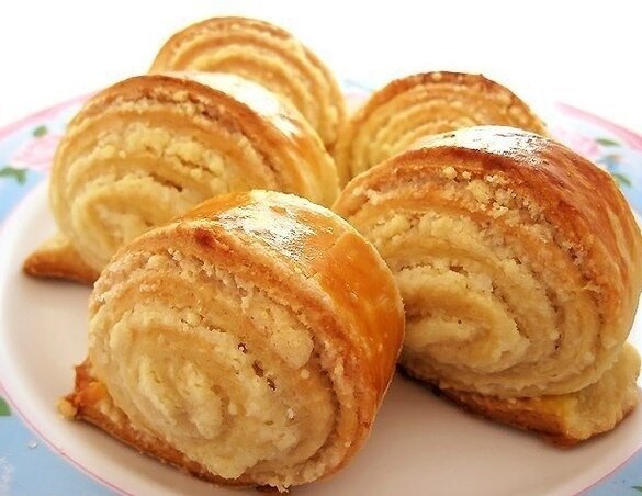 Для теста: 400 г муки пачка слив. масла (250 г) 2 яйца и 1 белок 250 г сметаны 1 ч.л. соды ванильный сахар - 1 п. Для начинки: 1 ст. муки пол пачки слив. масла 1,5 ст. сахара ванильный сахар Сверху: 1 желток 1 ст.л. молока Приготовление: 2. Отправить масло к муке, растереть в однородную массу, состоящую из крошек. Можно растирать руками или вилкой. При растирании руками очень важно всё делать быстро, пока масло не растаяло от контакта с тёплой кожей рук. 3. Добавить в массу ванильный сахар и соду. Гасить не нужно: сода войдёт в реакцию со сметаной и погасится. 4. Ввести яйца и сметану. Размешать всё вилкой до однородного состояния. Должно получиться довольно мягкое тесто. Если тесто остаётся чересчур липким – добавить ещё муки до нужной консистенции. Тесто должно быть такой консистенции, чтобы его можно было раскатать в пласт. 5. Приготовить начинку для булочек. Снова измельчить сливочное масло и растереть с мукой. 6. Добавить к массе белый и ванильный сахар, всё перемешать. Начинка го
