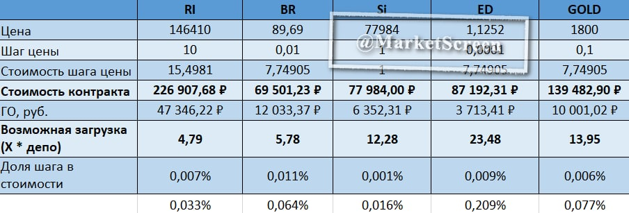 Тут перейдем к нижней строке. Это та же самая доля, но с учетом полной загрузки ГО. Так, брент при полных плечах принесет вам 0,064% с одного тика. А вот евродоллар сразу 0,2%.