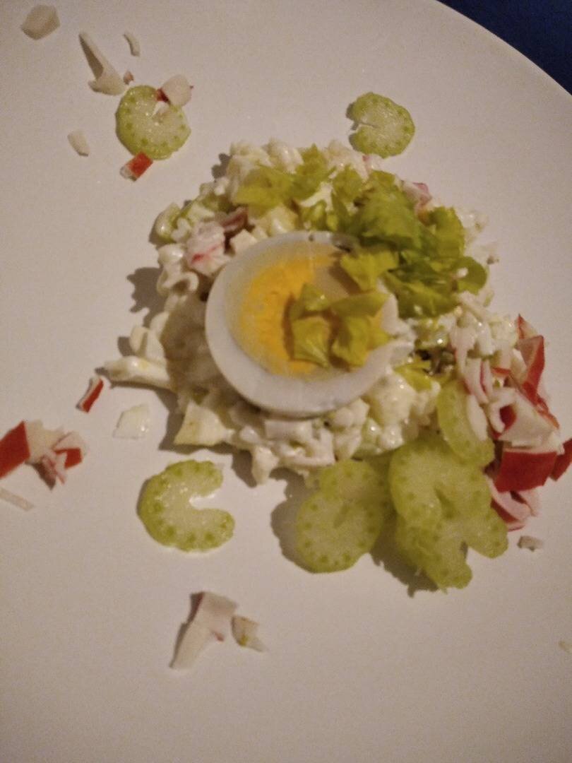 Очень вкусный салат. Представляю его в двух вариантах, легкий и более сытный. Готовится быстро и легко, а результат достоин любого праздничного стола. Ингредиенты: черешки сельдерея, яйца, яблоко крупное, крабовое мясо (палочки), майонез, рис отварной (для 2-ого варианта), соль, перец Способ приготовления: Сварить яйца вкрутую. Остудить и очистить. Нарезать мелким кубиком яйца, крабовое мясо, яблоко. Черешки сельдерея очистить от волокон и нарезать пластинками. Все смешать, добавить соль, перец и перемешать. Заправить майонезом. В первом, лёгком варианте салат готов. Если хотите блюдо посытнее добавьте в салат 3 столовых ложки отварного риса. В этом случае приготовление салата нужно начать с варки рассыпчатого риса. Приятного аппетита.