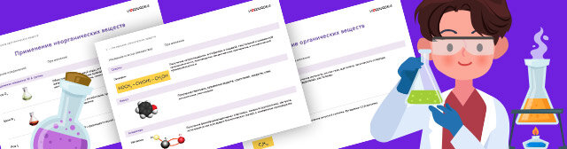 На уроках химии большую помощь учителю и ученикам могут оказать дополнительные материалы, например, таблицы, благодаря которым можно легче изучить новую тему, а также повторить и быстро вспомнить изученное. Таблицы по органической и неорганической химии содержат материал по применению основных классов органических соединений и отдельных представителей класса, а также по применению неорганических соединений неметаллов. Кроме того, в них есть формулы и молекулы отдельных веществ. В первой таблице указаны области применения классов органических соединений и отдельных представителей этих классов. В ней описывается применение алканов (метана и бутана), алкенов (этилена), диенов, алкинов (ацетилена), ароматических углеводородов (бензола, толуола), спиртов (метанола, этанола, высших спиртов, этиленгликоля, глицерина), фенола, альдегидов (метаналя, ацетальдегида), карбоновых кислот (муравьиной, уксусной, высших карбоновых кислот), сложных эфиров, жиров, углеводов (глюкозы, крахмала, целлюлозы)