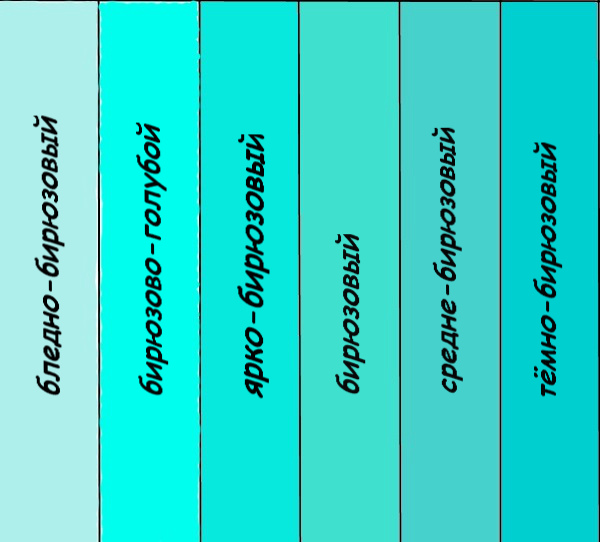 У бирюзового цвета существует много разных оттенков и тонов. Давайте ознакомимся с основными из них.