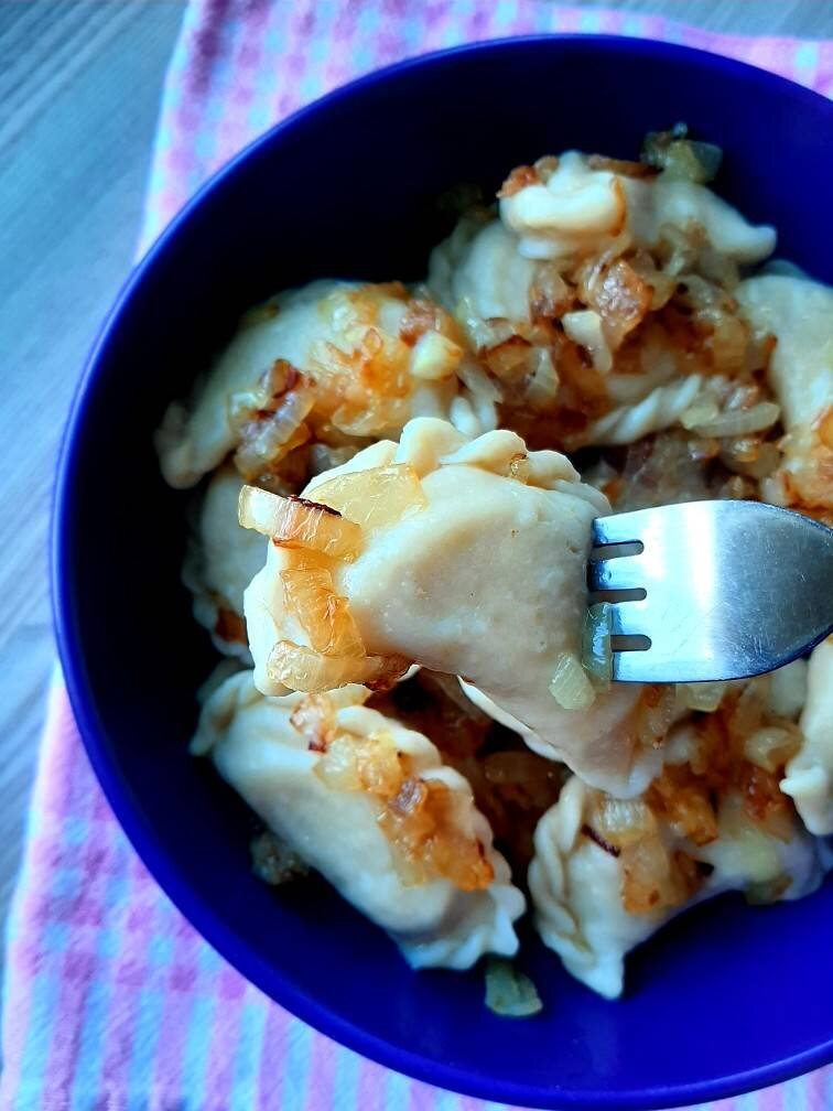 Ингредиенты: муки , тёплой воды , яйцо, растительного масла , соли, Для начинки, картофель, твёрдый сыр , лук, зелень укропа, петрушки Способ приготовления: Добавляем в тёплую воду соль, яйцо и растительное масло, размешиваем всё вместе, а потом добавляем муку и замешиваем крутое тесто. Отправляем его в пакет на 30 минут. Для начинки: варим картофель до готовности в подсоленной воде. Пока картофель варится, нарезаем мелко лук и обжариваем на сливочном масле до золотистого цвета. Твёрдый сыр натираем на тёрке. Зелень мелко режем. Разминаем картофель в пюре и даём немного остыть. Потом добавляем к нему лук, сыр и зелень и хорошо перемешиваем. Наша начинка готова. Тесто раскатываем на присыпанной мукой поверхности в пласт толщиной около 2 мм и стаканом вырезаем кружочки (Или же можно скатать тесто в колбаску и разрезать на маленькие кусочки, а затем каждый кусочек раскатать). На каждый кружочек кладём чайную ложку с горкой начинки хорошо скрепляем края. Варим наши вареники сразу или же за