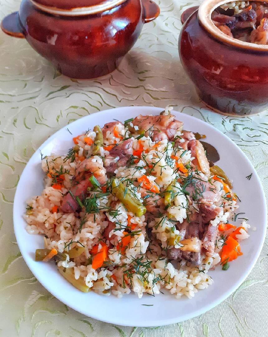 #курица Мясо курицы, а тем более, если это от домашней курицы, которое не всегда получается мягким, приготовленное таким способом мягкое и не сухое. А блюдо в общем вкусное, ароматное и лёгкое. Можно и на ужин и на обед. Ингредиенты: мясо курицы, у меня 2 окорочка, лука, моркови, замороженной зелёной фасоли, риса, соли, перца чёрного молотого, сухой петрушки, воды Способ приготовления: Мясо порезать на кусочки. Лук, морковь почистить. Подготовить необходимое количество риса, соли, перца. Сковороду поставить на плиту, включить. Выложить подготовленное мясо. Если мясо из морозилки, то нет необходимости ждать, когда оно совсем растает, а порезать на кусочки как только будет резаться. Закрыть крышкой. Обжарить на среднем огне. Не солить. Так соль не заберёт жидкость и мясо будет сочнее. Не забывать помешивать. Пока мясо обжаривается, лук порезать мелким кубиком. Морковь брусочками. Рис помыть в 2-3 водах. Когда мясо слегка обжарится, у меня на это ушло 15 мин, посолить. Для этого взять 1/3