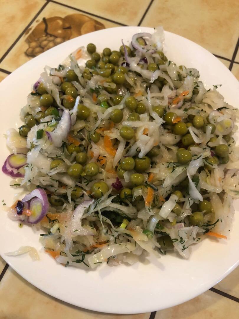 Лёгкий и полезный салат👍🏼 . Отлично подойдёт для тех кто постится Ингредиенты: гр квашеной капусты, маленькая луковица (либо маленький пучок зелёного лука), ст л зелёного горошка, укроп, нерафинированное растительное масло, небольших картофелины, отваренных в мундире по желанию Способ приготовления: Лук нарезать тонкими полукольцами, укроп мелко нарубить, добавить капусту, зелёный горошек, перемешать, заправить маслом. По желанию добавить картофель в мундире, нарезав средним кубиком. Приятного аппетита. 🌸