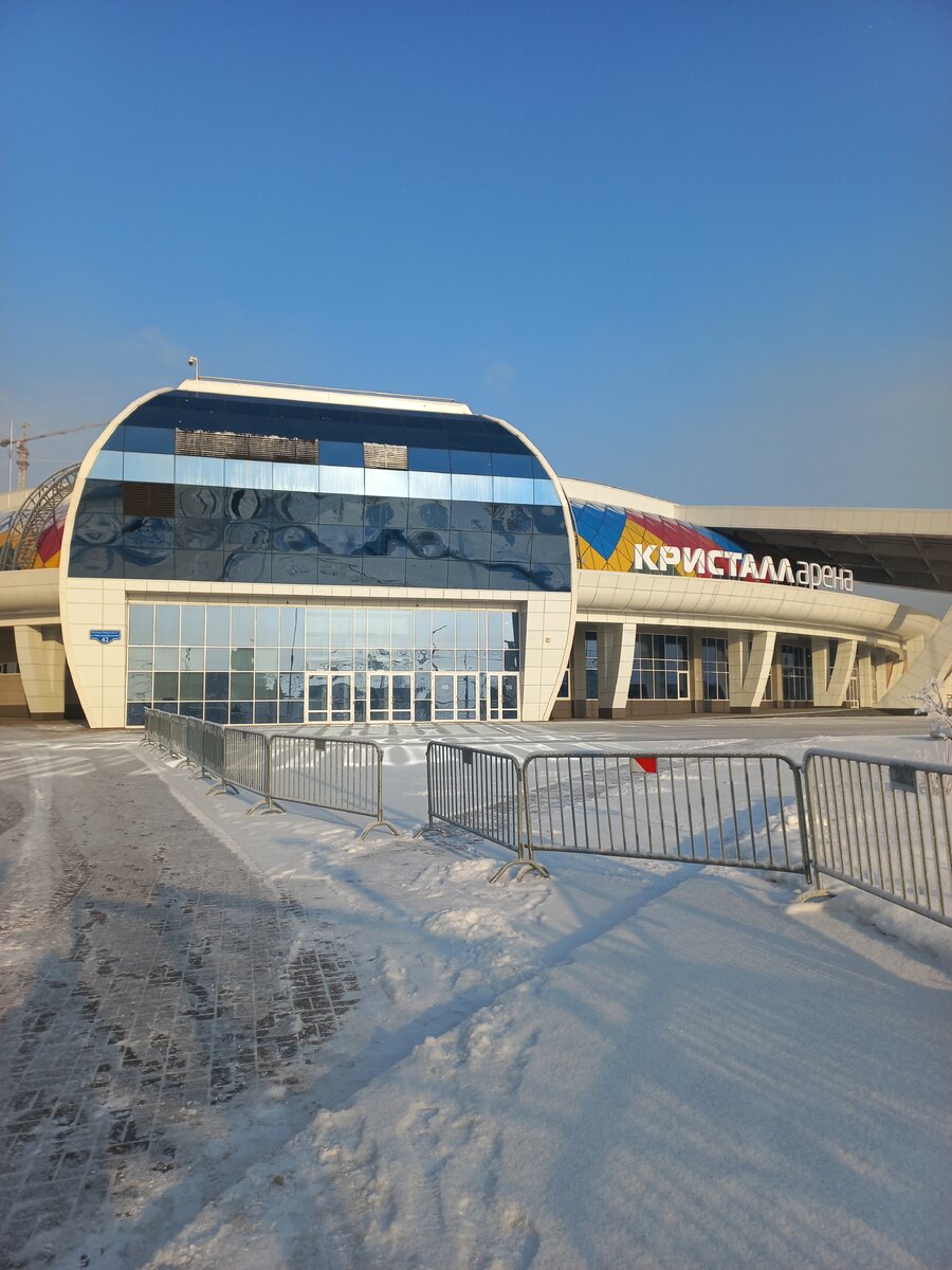 В Советском районе Красноярска, по которому я продолжал гулять, несмотря на название, есть много современных зданий. О некоторых из них я рассказывал в своей предыдущей статье. Сейчас же я хочу рассказать о "Кристалл-Арена". Эта ледовая арена была построена в 2018 году к Зимней Универсиаде 2019 года, которая, как известно, проходила именно в Красноярске. Вместимость здания составляет 3500 человек. Это средний показатель. Вообще мне сложно оценивать архитектуру ледовой арены. Фасад выполнен из композитных панелей и цветных стекол. Сверху же здание похоже на какую-то тарелку. Лично мое отношение к "Кристалл-Арене" скорее нейтральное. Я бы точно его не назвал красивым, но каких-либо негативных чувств оно у меня не вызывает. Могли бы, конечно, построить и лучше, но это далеко не самый плохой пример ледовых арен, которые я видел. Некоторые похожи на какие-то ангары, то есть у них чисто утилитарная функция. "Кристалл-Арена" все же имеет какую-то архитектуру.